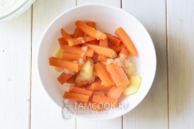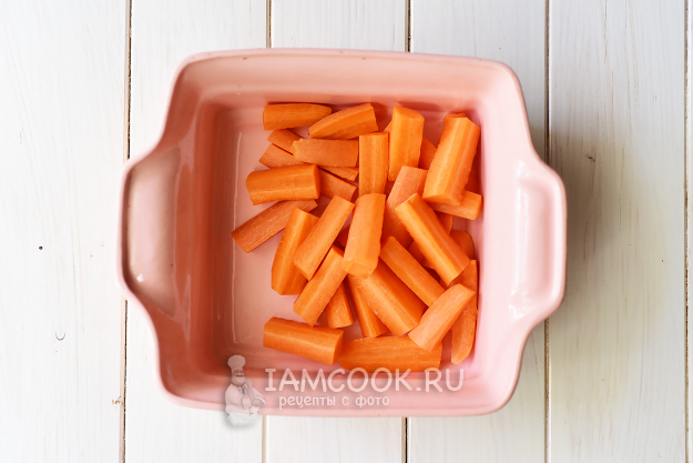 Морковь нарежем небольшими брусочками и выложим на дно формы.