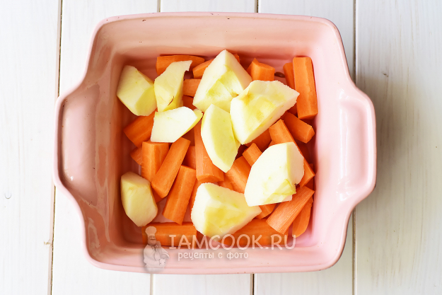 Мякоть яблока нарежем произвольными кусочками и выложим к моркови в форму. Форму затянем фольгой и отправим запекаться при температуре 220 градусов в духовку до мягкости моркови и яблока.