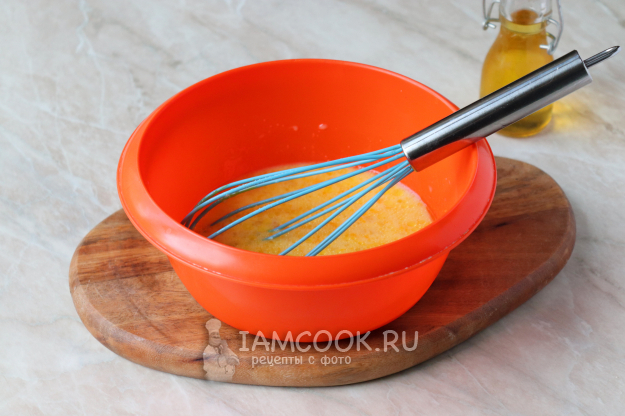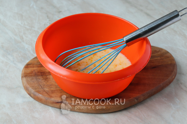 В глубокой миске соедините молоко комнатной температуры и куриное яйцо. С помощью венчика перемешайте массу до однородного состояния.