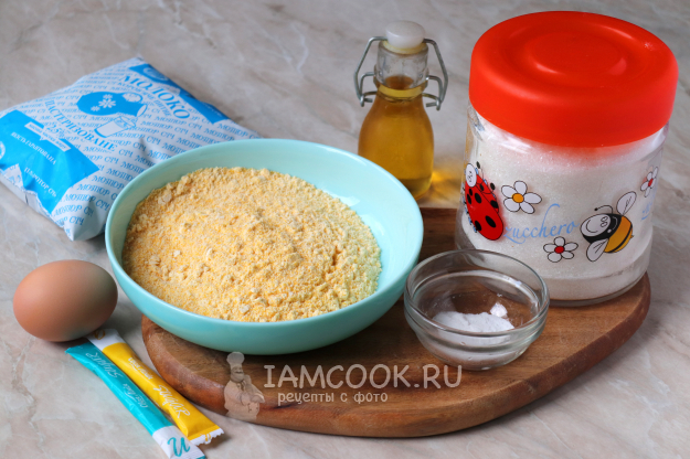 Для приготовления вафель из кукурузной муки в вафельнице подготовьте продукты по списку.