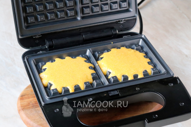Панели вафельницы смажьте тонким слоем растительного масла и разогрейте. Затем выложите по 1,5 столовых ложки теста на одну вафлю.