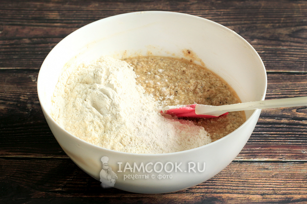 Затем добавьте муку, разрыхлитель и ванилин. Размешайте до пышного теста.