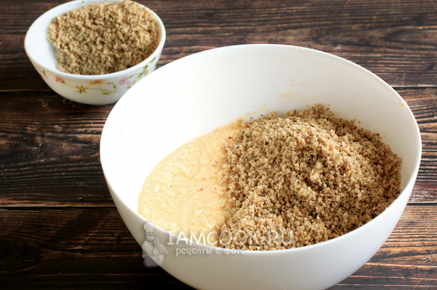 Грецкие орехи нужно заранее обжарить и слегка очистить от шелухи. Затем измельчить блендером до получения мелких кусочков, но не муки.
