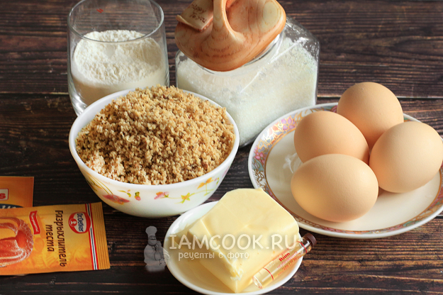 Для приготовления кекса с грецкими орехами подготовьте продукты по списку. Они должны быть комнатной температуры.