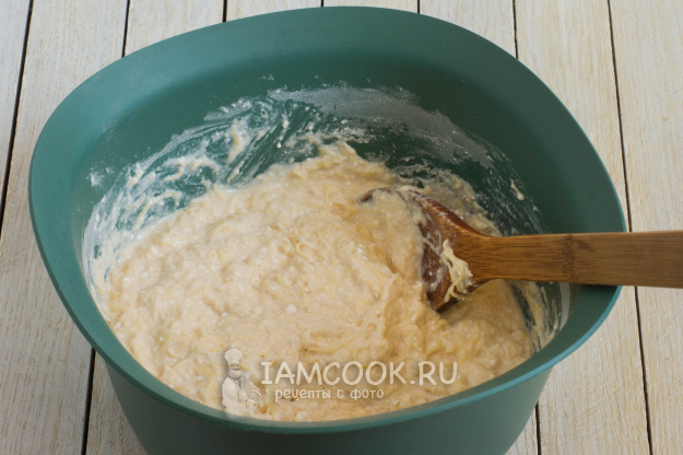 Добавьте в тесто соль, сахар, сухие дрожжи и творог. Перемешайте все вместе до получения максимально однородной массы. Постепенно добавляя в полученную массу просеянную муку, замесите тесто по консистенции как густая сметана. Поставьте полученное тесто в теплое место на 1 час. Больше тесто для оладий не перемешивайте.