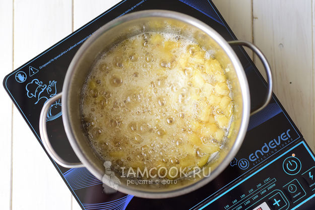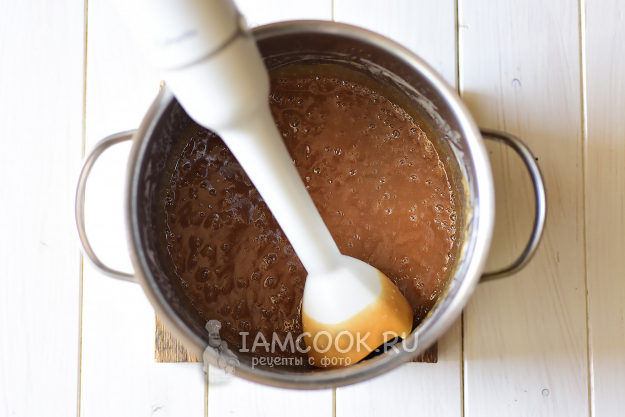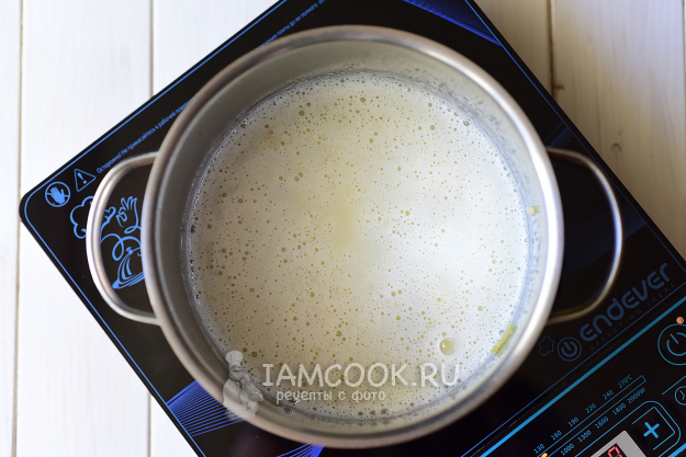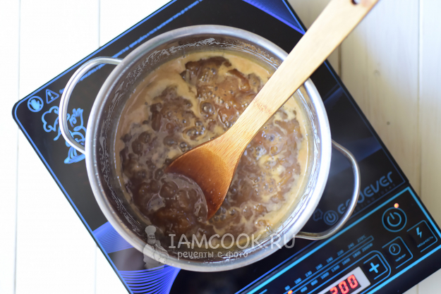 Молоко с содой зальем к грушам и продолжим уваривать грушевую массу еще 1 час на маленьком огне, постоянно помешивая. Будет появляться белая пенка, которую по возможности следует снимать ложкой.