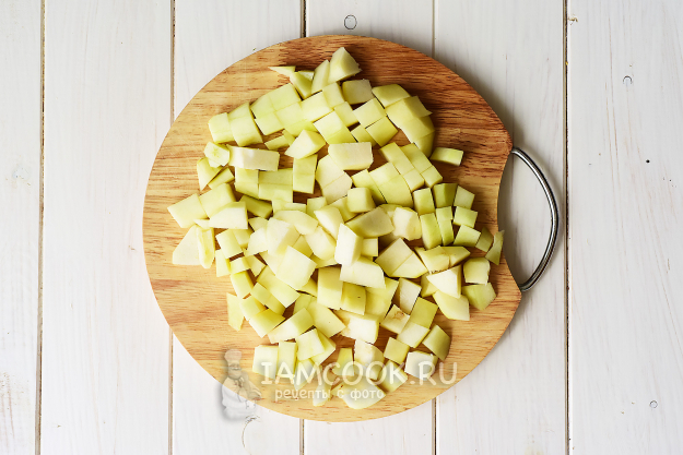 Снимем с груш кожуру, отрежем хвостики и вырежем семенной отдел. Грушевую мякоть нарежем небольшими кубиками.