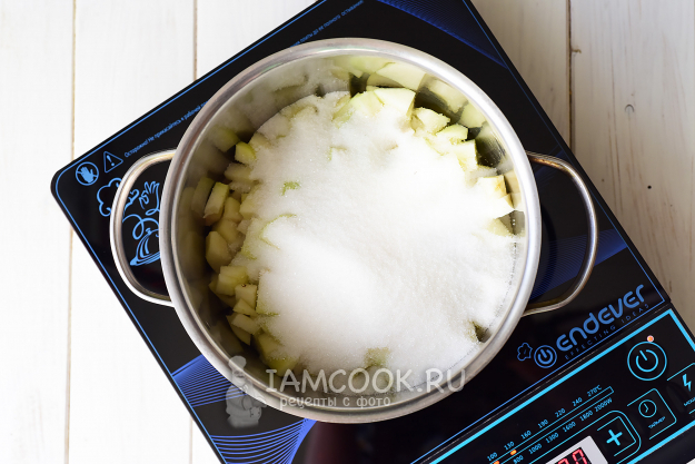 Выложим нарезанные груши в кастрюлю и добавим весь сахар. Поставим на маленький огонь.