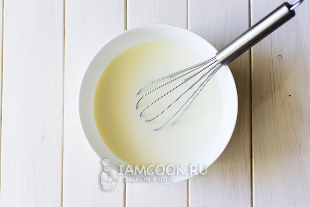 В миску зальем молоко, добавим соду и перемешаем венчиком.