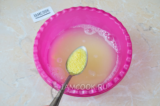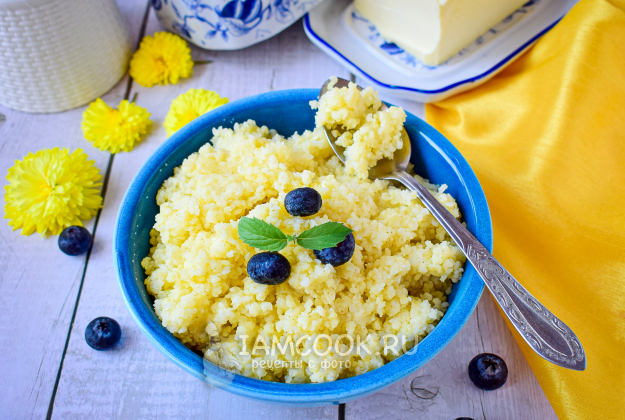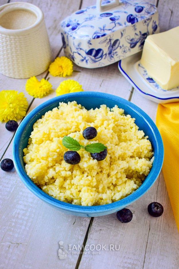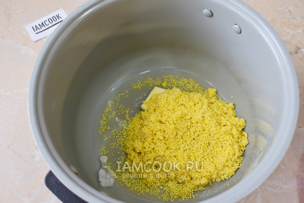 Пшено промойте горячей водой. При этом смоется налет, покрывающий каждое зернышко. Если пшено не промыть, то каша будет горчить. Затем слейте с пшена всю горячую воду.