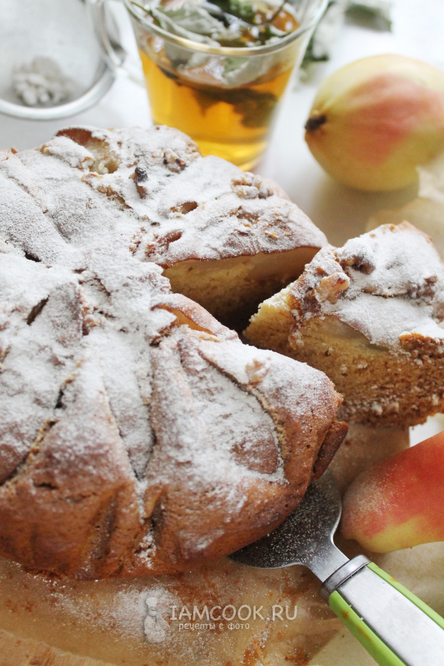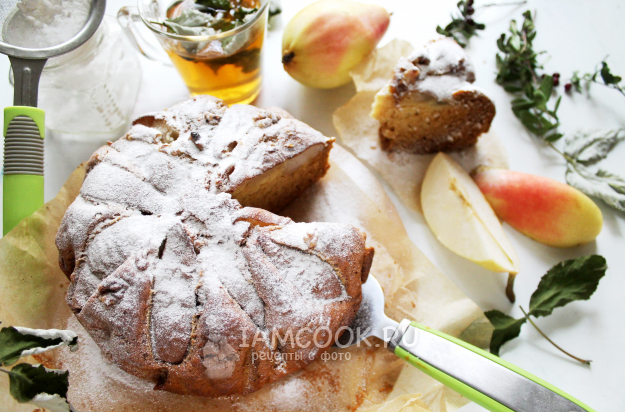 Постный пирог с грушами готов. Остужаем его и посыпаем сахарной пудрой. Подаем эту выпечку с чаем (особенно хороши травяные чаи) или кофе.