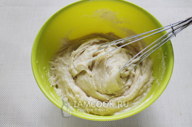Сначала смешаем все жидкие компоненты: кипяченую воду, подсолнечное масло и растопленный мед. Добавим сахар. Следом начинаем постепенно всыпать муку с разрыхлителем и крахмал.