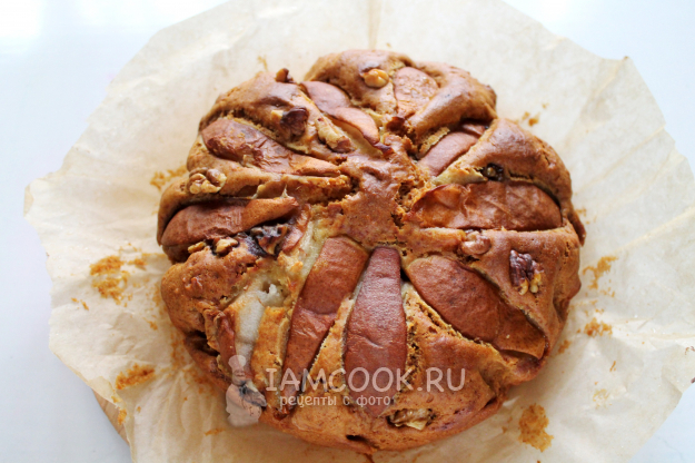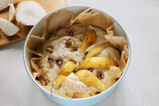 Готовое тесто выкладываем в форму, сверху укладываем, чуть притапливая в тесто, крупно нарезанные орехи и дольки груш.