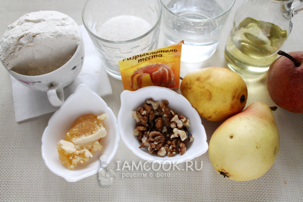 Возьмем необходимые продукты и приступим к приготовлению постного пирога с грушами.