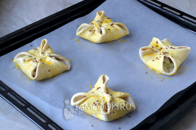 Выложите их на противень, застеленный пергаментом или силиконовым ковриком. Поверхность слоек смажьте взбитым яйцом и посыпьте семенами льна (вместо льна можно использовать кунжут или мак).