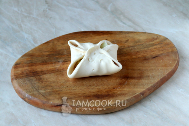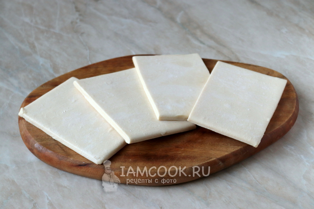 Каждую из которых немного раскатайте, чтобы получился квадрат (как на фото). Чтобы тесто не приставало к рабочей поверхности, посыпьте её небольшим количеством муки.