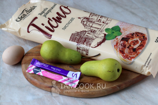 Для приготовления слоек с грушей из слоеного бездрожжевого теста подготовьте необходимые ингредиенты по списку. Слоеное тесто должно быть мягким, поэтому заранее достаньте его из морозильной камеры, чтобы оно оттаяло.