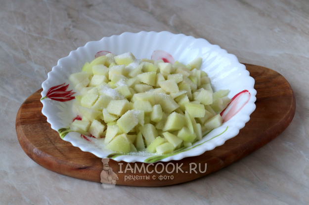 Груши почистите, вырежьте из них сердцевину, а мякоть нарежьте небольшими кубиками. Сахар добавьте по вкусу и перемешайте. На данном этапе в начинку можно добавить молотую корицу или немного ванильного сахара, они сделают её более ароматной.