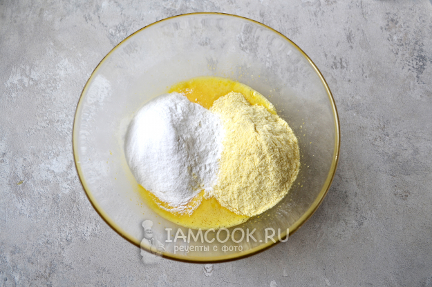 Всыпьте разрыхлитель и оба вида муки: кукурузную и рисовую.