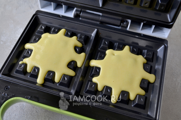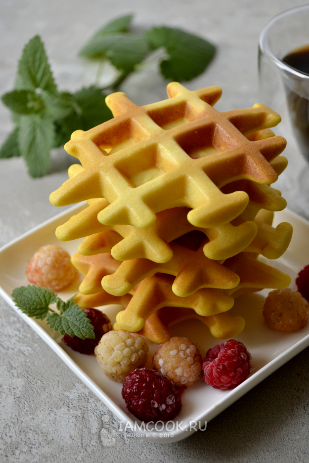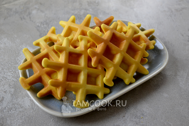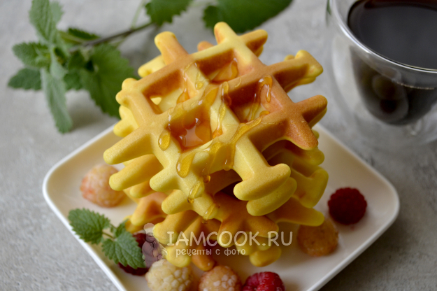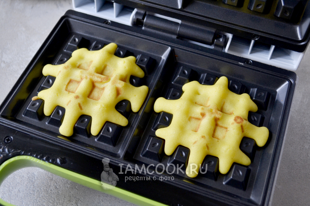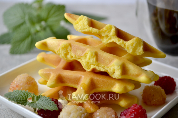 Таким способом испеките все вафли. Благодаря кукурузной муке вафли получаются красивого ярко-желтого цвета.