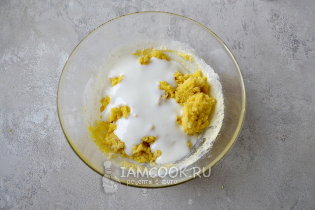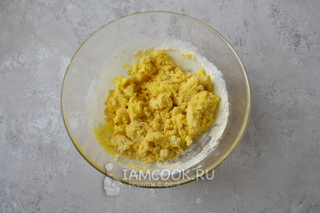 Перемешайте муку с яичной массой.