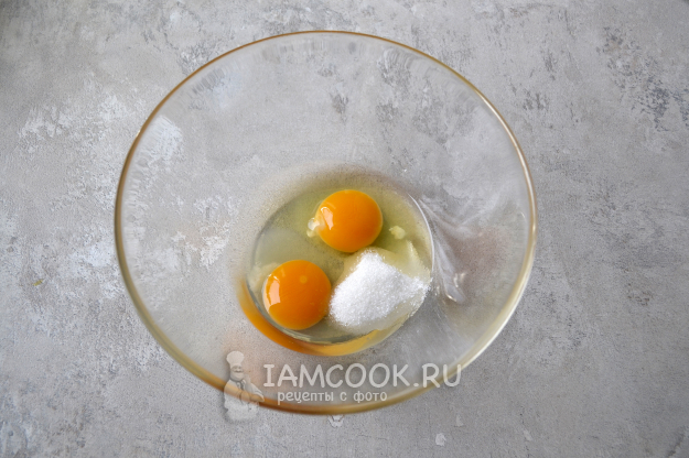 В глубокую миску разбейте яйца и всыпьте сахар.