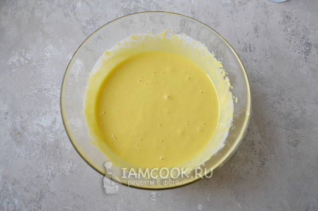 Венчиком перемешайте тесто до однородной массы. Тесто не должно быть очень густым. Оно свободно стекает с ложки.