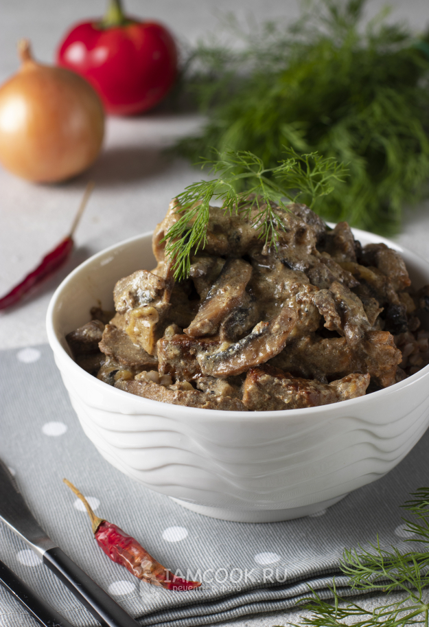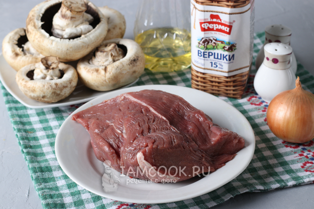 Для приготовления бефстроганов из говядины с грибами со сливками подготовить из списка необходимые ингредиенты.