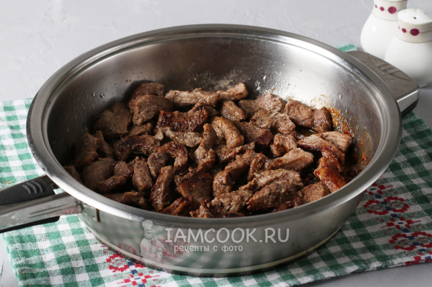 Вернуть в сковороду говядину, перемешать с луком и грибами.