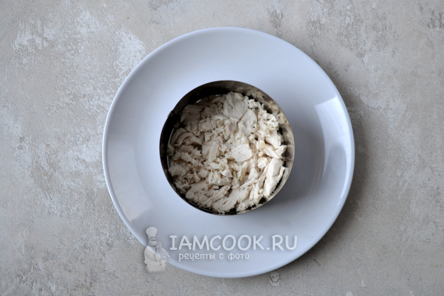 Для подачи порционного салата воспользуйтесь кулинарным кольцом. Первым слоем положите куриную грудку. Каждый слой немного смазывайте майонезом и немного уплотняйте. По желанию слои салата немного посыпайте черным молотым перцем и солью.