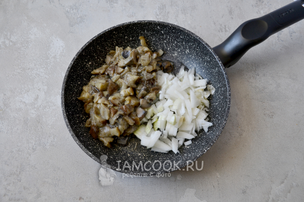 Разогрейте сковороду с растительным маслом и положите мелко нарезанные вареные грибы и очищенный мелко нарезанный репчатый лук.