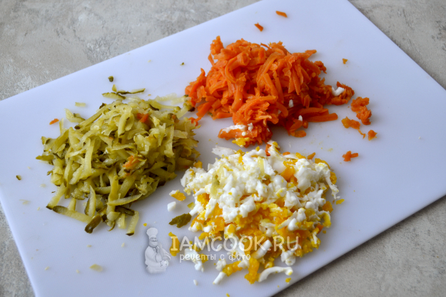Натрите на средней терке маринованные огурцы, морковь, яйца. Половину целой моркови оставьте для украшения салата.