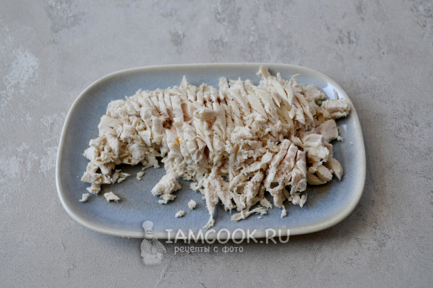 Куриную грудку заранее отварите, достаньте из бульона и охладите.