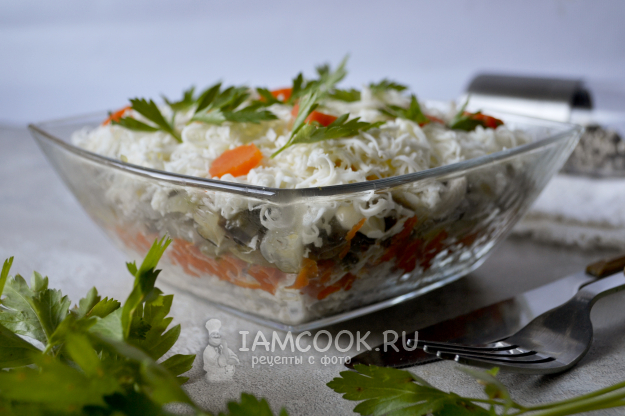 Можно подать салат «Мельница» и в общем салатнике, также укладывая ингредиенты слоями и немного смазывая каждый слой майонезом.