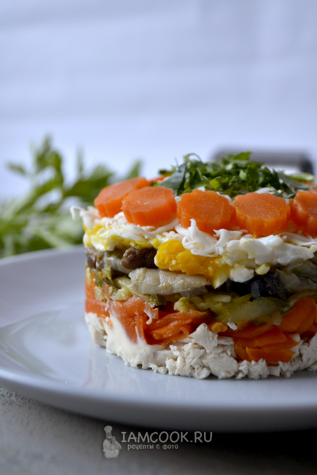 Салат очень вкусный и сытный. В нем прекрасно сочетаются куриное мясо и обжаренные с луком грибы, морковь добавляет сладости, маринованные огурцы - пикантности, а сыр и яйца - нежный сливочный вкус.