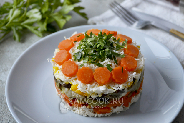 Сейчас аккуратно снимите кулинарное кольцо и украсьте салат по желанию: мелко нарезанной свежей петрушкой, цветочками из моркови.