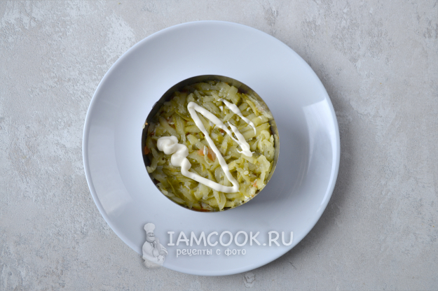 Третий слой - из огурца. Не забывайте наносить сеточку из майонеза.