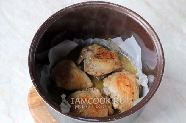 Спустя время выложим бёдра кожицей вниз в чашу мультиварки, предварительно застелив её дно листом пергамента.