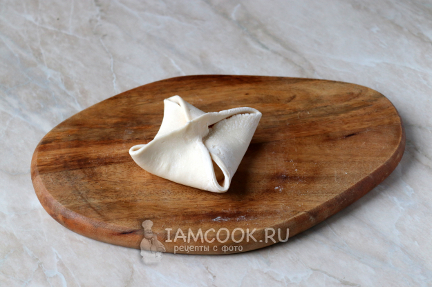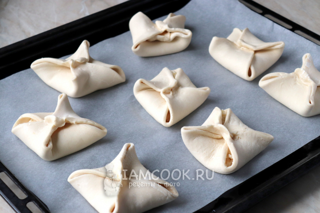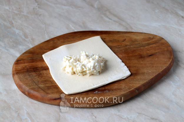 Каждую часть теста немного раскатайте, чтобы получился квадрат. В центр квадрата выложите столовую ложку творожно-яблочной начинки.