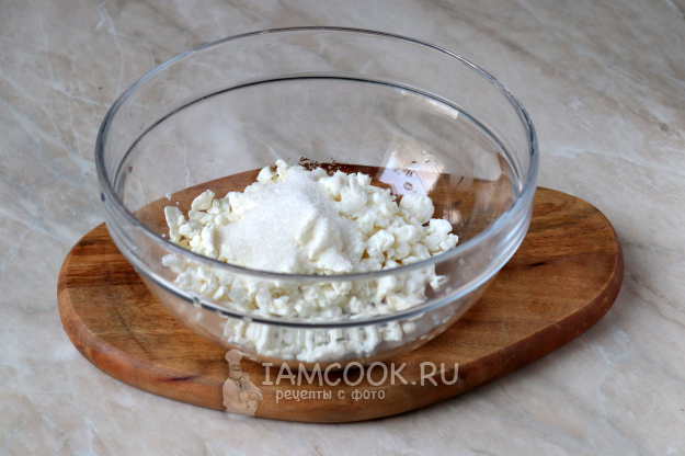 Для начинки в глубокой миске соедините творог (у меня - 5%, но подойдёт абсолютно любой) и сахарный песок. По желанию можете добавить немного ванильного сахара или молотой корицы, они придадут начинке приятный аромат и послевкусие.