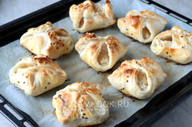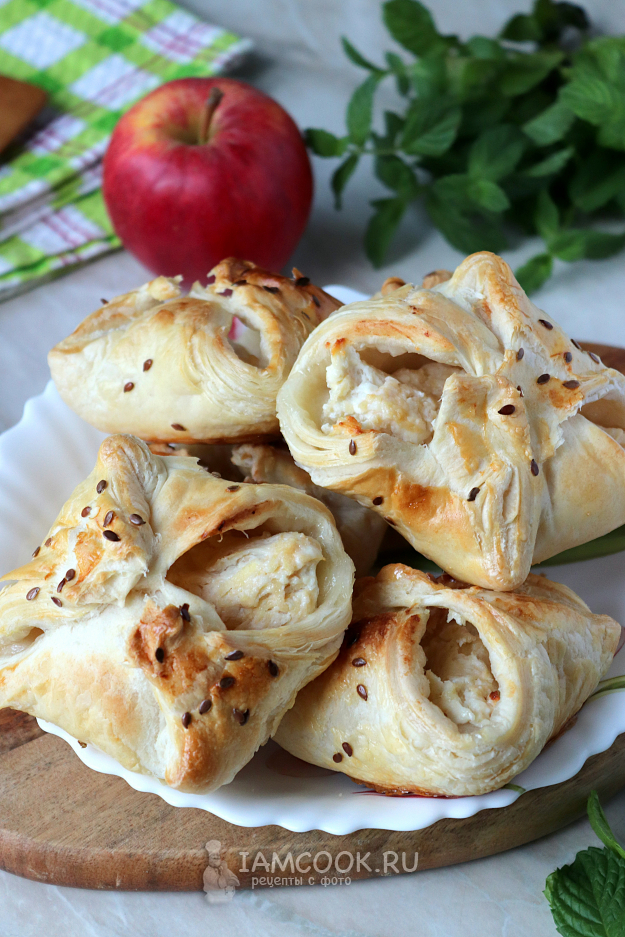 Слойки с яблоком и творогом, приготовленные по данному рецепту, получаются очень вкусными и ароматными. Перед подачей их можно дополнительно посыпать сахарной пудрой.