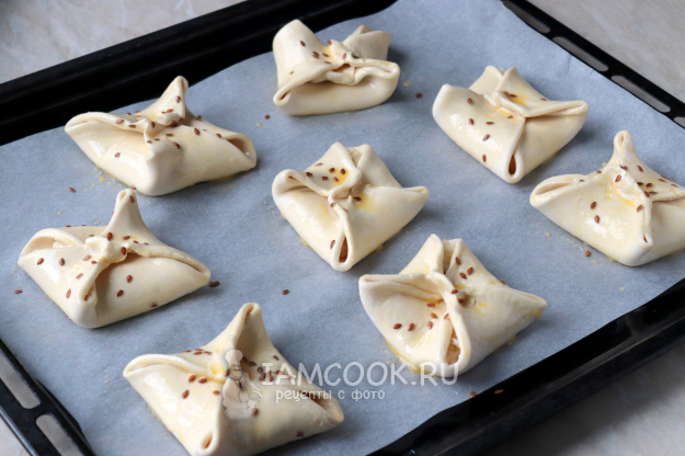 Поверхность слоек смажьте взбитым яйцом и посыпьте семенами льна, кунжута или мака.