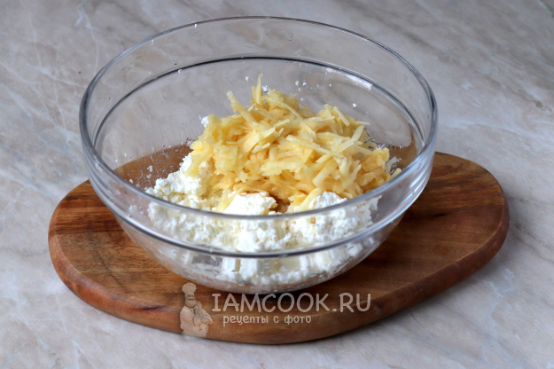 Яблоко очистите, удалите семенную коробочку, а мякоть натрите на крупной тёрке. Яблочную стружку полейте лимонным соком, чтобы она не потемнела, и сразу же добавьте в миску с творожной массой.