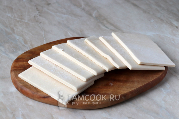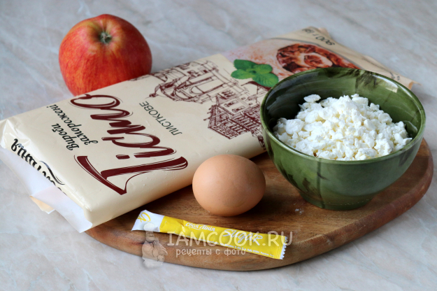 Возьмите все продукты для слоек с яблоком и творогом. Тесто заранее достаньте из морозильной камеры, чтобы оно оттаяло и стало мягким.