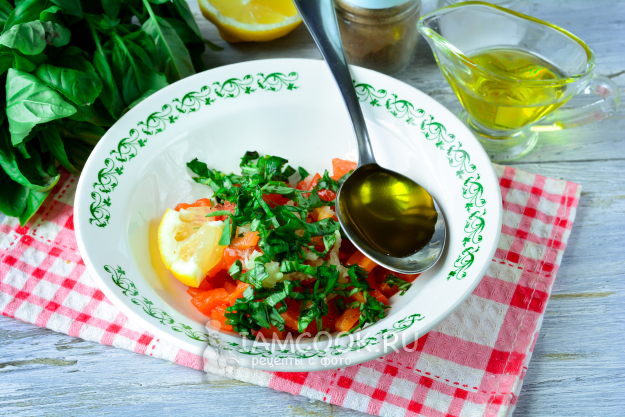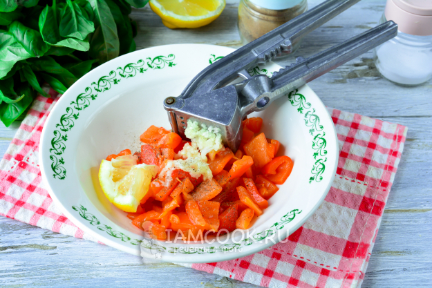 К сладкому перцу выдавите чеснок, сбрызните лимонным соком начинку, добавьте по вкусу соль, черный молотый перец.