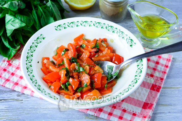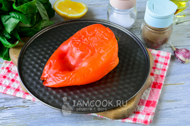Сладкий перец запекайте в духовке 25 минут при 200°С. Затем остудите его.