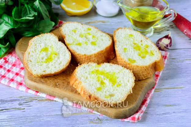 Нарежьте ломтиками багет, сбрызните хлеб оливковым маслом.