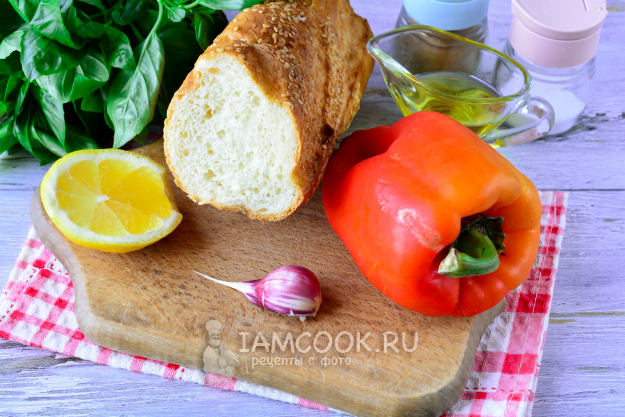 Возьмите ингредиенты для приготовления брускетты с печеным перцем.
