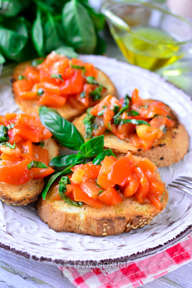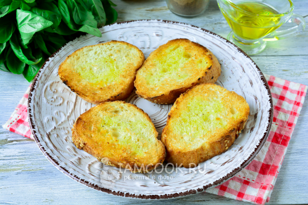 Запекайте багет в духовке при 200°С около 10 минут, чтобы получилась хрустящая брускетта.