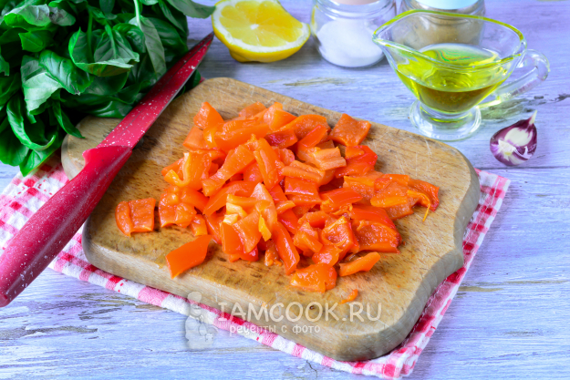 Нарежьте небольшими кусочками запеченный перец.